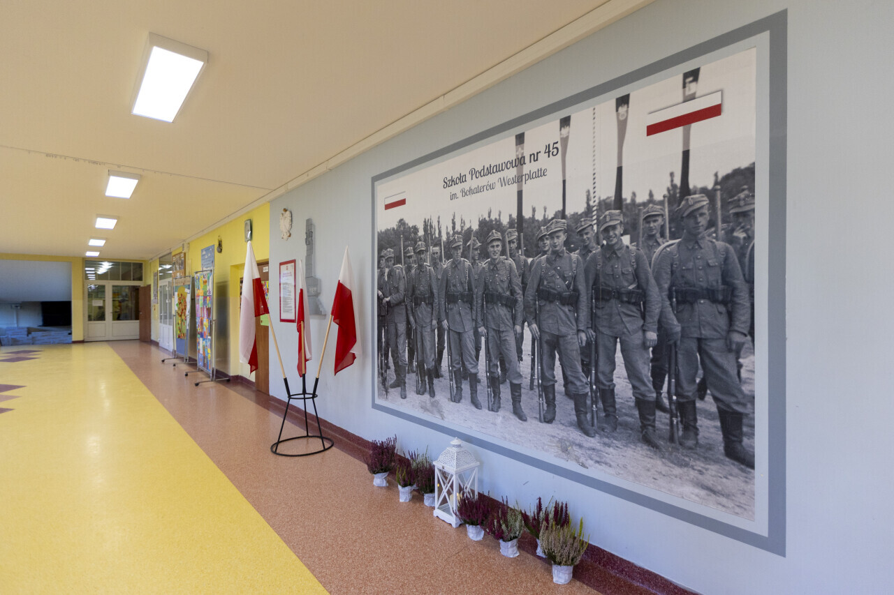 Gdańsk. Uroczystość nadania nowego sztandaru w szkole podstawowej nr 45 im. Bohaterów Westerplatte. W Uroczystości Udział wzięli między innymi Emilia Lodzińska, Zastępczyni Prezydenta Miasta Gdańska ds. rozwoju przestrzennego i mieszkalnictwa oraz Piotr Grzelak, Z-ca Prezydenta ds. zrównoważonego rozwoju i gospodarki.