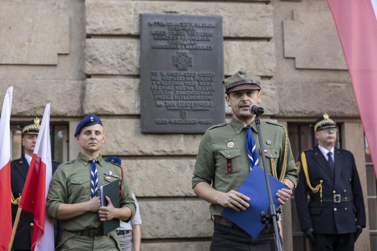 Gdańsk. Obchody 86. rocznicy wybuchu II wojny światowej. Nz. Uroczystość pod tablicą upamiętniającą harcmistrza Jana Ożdżyńskiego.