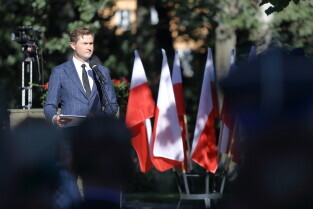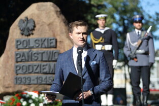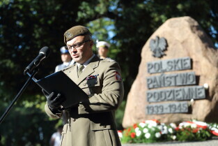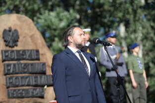 Gdańsk, pomnik Polskiego Państwa Podziemnego. Uroczystość upamiętniająca 76. rocznicę wybuchu Powstania Warszawskiego. Nz. Wiceprezydent Gdańska Piotr Grzelak.