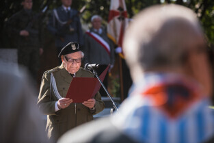 Gdańsk, Pomnik "TYM, CO ZA POLSKOŚĆ GDAŃSKA" Uroczystość upamiętniająca czyn bojowy Polskich Sił Zbrojnych na froncie wschodnim. Nz. Por. Henryk Bajduszewski, przewodniczący Rady Kombatantów i Osób Represjonowanych Województwa Pomorskiego