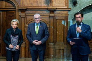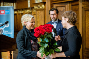 Gdańsk, Dwór Artusa. Uroczystość z okazji Dnia Pracownika Socjalnego. Nz. (od lewej) Małgorzata Niemkiewicz-dyrektor MOPR, wiceprezydent Piotr Kowalczuk i Andrzej Stawicki