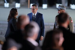 Gdańsk, Westerplatte. Uroczystości 80. rocznicy wybuchu II Wojny Światowej. Nz. Prezydent Gdańska Aleksandra Dulkiewicz i Mateusz Morawiecki-Prezes Rady Ministrów.