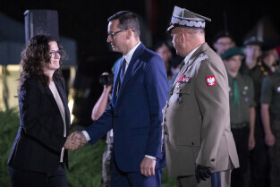 Gdańsk, Westerplatte. Uroczystości 80. rocznicy wybuchu II Wojny Światowej. Nz. prezydent Gdańska Aleksandra Dulkiewicz i premier RP Mateusz Morawiecki