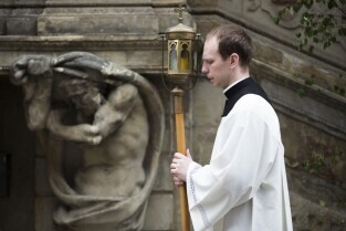 Gdańsk, Główne i Stare Miasto. Procesja eucharystyczna Najświętszego Ciała i Krwi Chrystusa (Boże Ciało). Nz. proboszcz Bazyliki Mariackiej Ks. prałat Ireneusz Bradtke