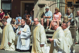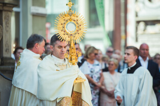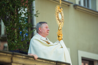 Gdańsk, Główne i Stare Miasto. Procesja eucharystyczna Najświętszego Ciała i Krwi Chrystusa (Boże Ciało). Nz. Biskup pomocniczy Archidiecezji Gdańskiej Wiesław Szlachetka