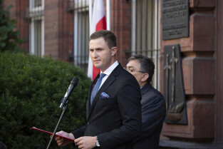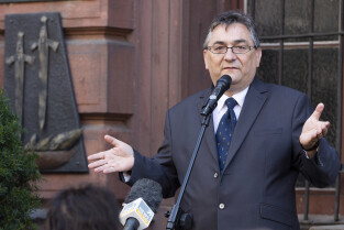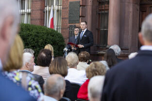 Uroczystości pod dawną Victoriaschule. Hołd dla polskich ofiar z września 1939 roku. Gdańsk, ul. Kładki. Nz. Prezes GAiT Maciej Lisicki