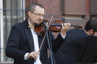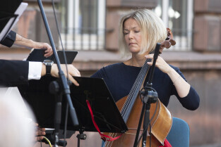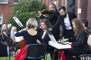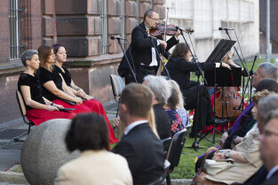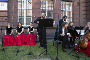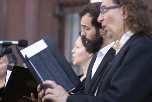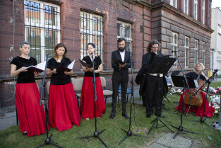 Uroczystości pod dawną Victoriaschule. Hołd dla polskich ofiar z września 1939 roku. Gdańsk, ul. Kładki. Nz. Cappella Gedanensis