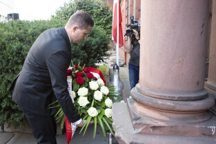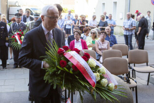 Uroczystości pod dawną Victoriaschule. Hołd dla polskich ofiar z września 1939 roku. Gdańsk, ul. Kładki. Nz. Z-ca Prezydenta Gdańska Piotr Grzelak
