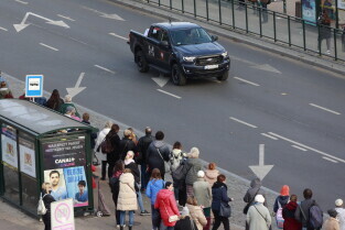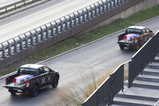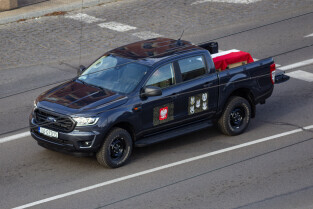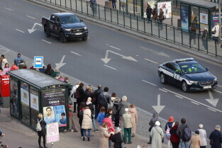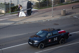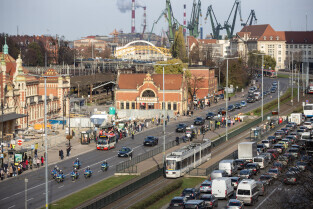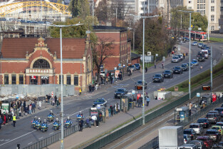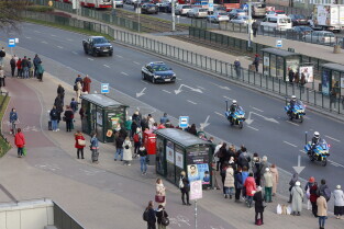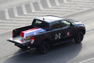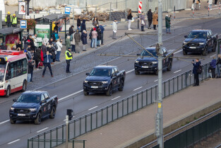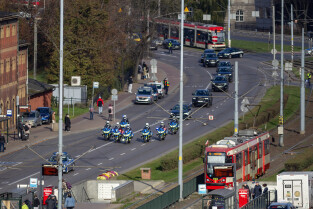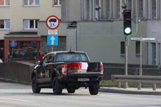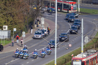 Gdańsk. Kolumna wojskowa ze szczątkami obrońców Westerplatte, przejechała w asyście policji przez centrum miasta, w związku z uroczystym pochówkiem żołnierzy na nowym cmentarzu wojskowym na Westerplatte.