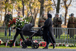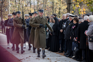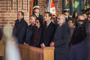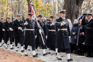 Gdańsk, Nowy Cmentarz Wojska Polskiego na Westerplatte. Uroczystości pogrzebowe Obrońców Westerplatte. Obecni byli m.in.: prezydent Andrzej Duda, Minister Obrony Narodowej Mariusz Błaszczak, wiceminister kultury i dziedzictwa narodowego Jarosław Sellin, prezydent Gdańska Aleksandra Dulkiewicz, przewodnicząca Rady Miasta Gdańska Agnieszka Owczarczak, marszałek województwa pomorskiego Mieczysław Struk i wojewoda pomorski Dariusz Drelich