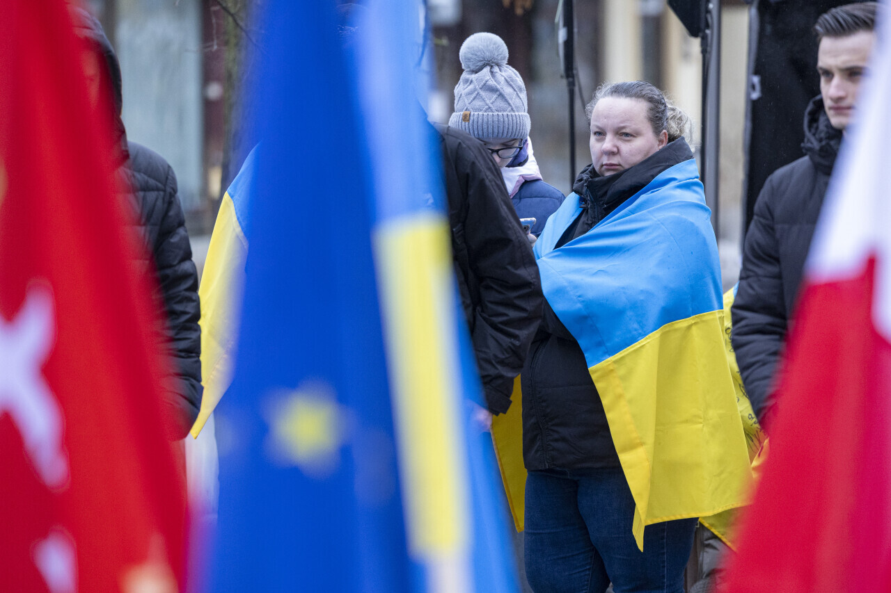 Gdańsk. Mer Mariupola na uchodźstwie Wadym Bojczenko, wojewoda pomorska Beata Rutkiewicz, wicemarszałek województwa pomorskiego Marcin Skwierawski, Prezydent Aleksandra Dulkiewicz, Przewodnicząca Rady Miasta Agnieszka Owczarczak, zastępcy prezydenta, Emilia Lodzińska i Piotr Grzelak, radna Kamila Błaszczyk, p.o. dyrektora ECS Magdalena Mistat oraz licznie przybyli goście i przedstawiciele mniejszości ukraińskiej złożyli kwiaty i znicze na skwerze Bohaterów Mariupola w IV rocznicę wybuchu pełnoskalowej wojny na Ukrainie