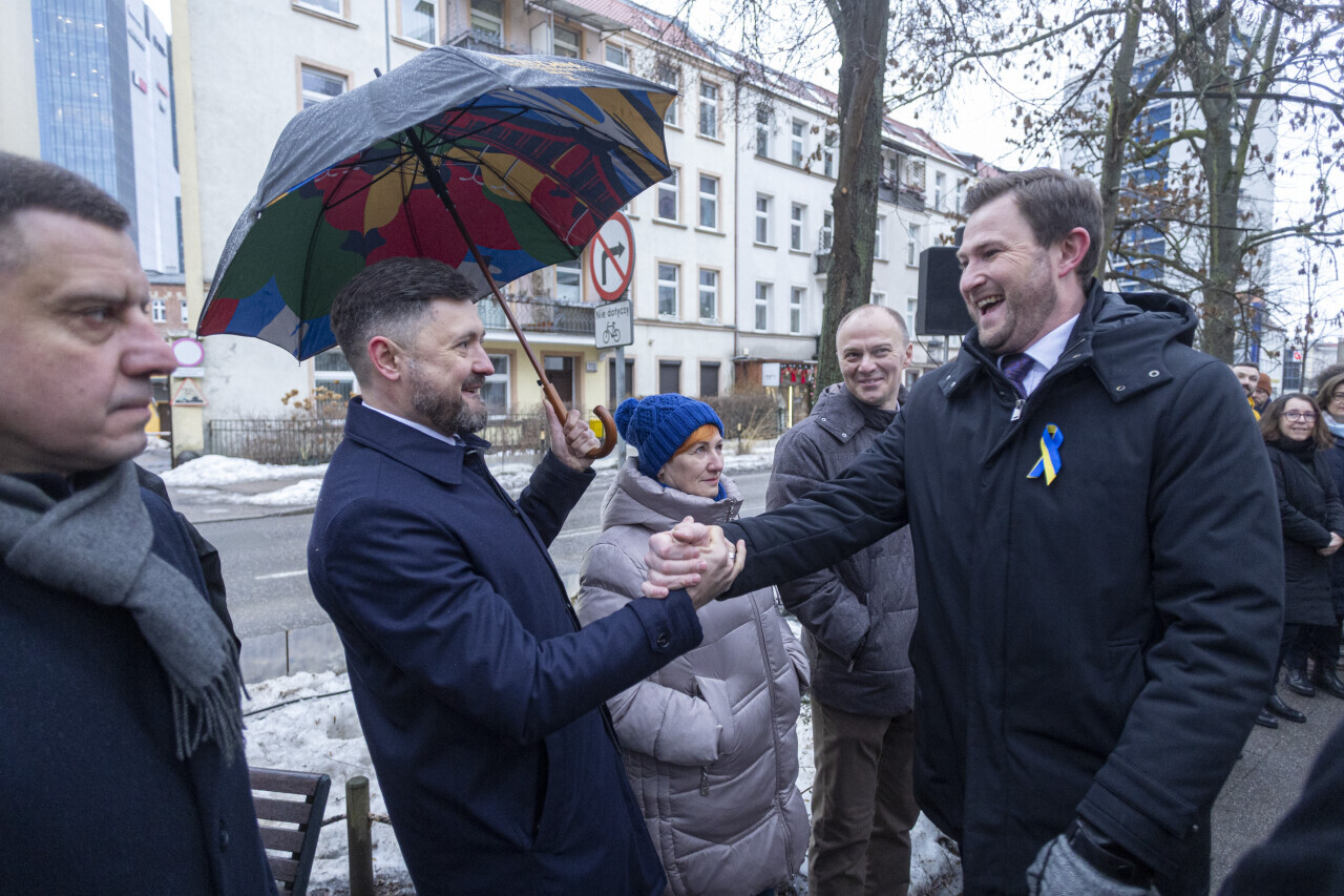 Gdańsk. Mer Mariupola na uchodźstwie Wadym Bojczenko, wojewoda pomorska Beata Rutkiewicz, wicemarszałek województwa pomorskiego Marcin Skwierawski, Prezydent Aleksandra Dulkiewicz, Przewodnicząca Rady Miasta Agnieszka Owczarczak, zastępcy prezydenta, Emilia Lodzińska i Piotr Grzelak, radna Kamila Błaszczyk, p.o. dyrektora ECS Magdalena Mistat oraz licznie przybyli goście i przedstawiciele mniejszości ukraińskiej złożyli kwiaty i znicze na skwerze Bohaterów Mariupola w IV rocznicę wybuchu pełnoskalowej wojny na Ukrainie