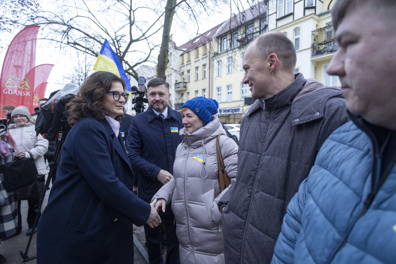 Gdańsk. Mer Mariupola na uchodźstwie Wadym Bojczenko, wojewoda pomorska Beata Rutkiewicz, wicemarszałek województwa pomorskiego Marcin Skwierawski, Prezydent Aleksandra Dulkiewicz, Przewodnicząca Rady Miasta Agnieszka Owczarczak, zastępcy prezydenta, Emilia Lodzińska i Piotr Grzelak, radna Kamila Błaszczyk, p.o. dyrektora ECS Magdalena Mistat oraz licznie przybyli goście i przedstawiciele mniejszości ukraińskiej złożyli kwiaty i znicze na skwerze Bohaterów Mariupola w IV rocznicę wybuchu pełnoskalowej wojny na Ukrainie