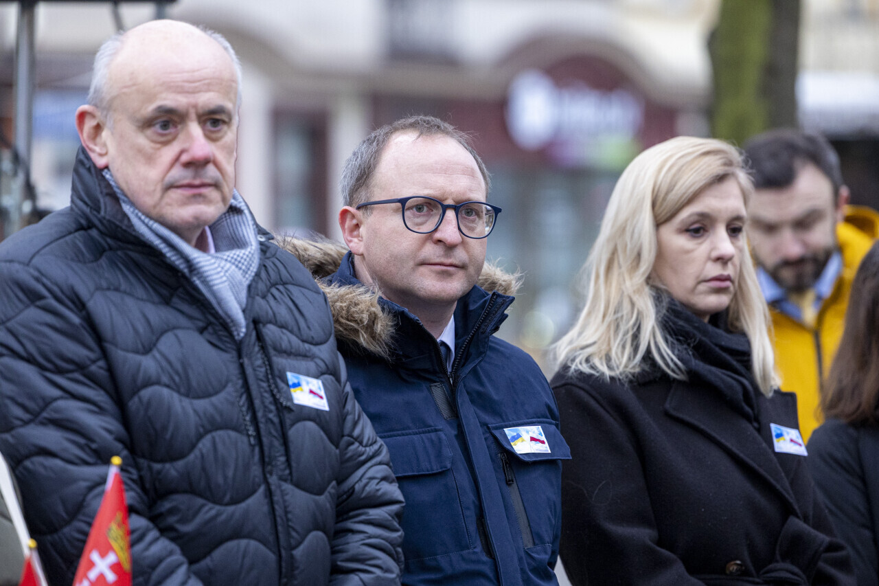 Gdańsk. Mer Mariupola na uchodźstwie Wadym Bojczenko, wojewoda pomorska Beata Rutkiewicz, wicemarszałek województwa pomorskiego Marcin Skwierawski, Prezydent Aleksandra Dulkiewicz, Przewodnicząca Rady Miasta Agnieszka Owczarczak, zastępcy prezydenta, Emilia Lodzińska i Piotr Grzelak, radna Kamila Błaszczyk, p.o. dyrektora ECS Magdalena Mistat oraz licznie przybyli goście i przedstawiciele mniejszości ukraińskiej złożyli kwiaty i znicze na skwerze Bohaterów Mariupola w IV rocznicę wybuchu pełnoskalowej wojny na Ukrainie