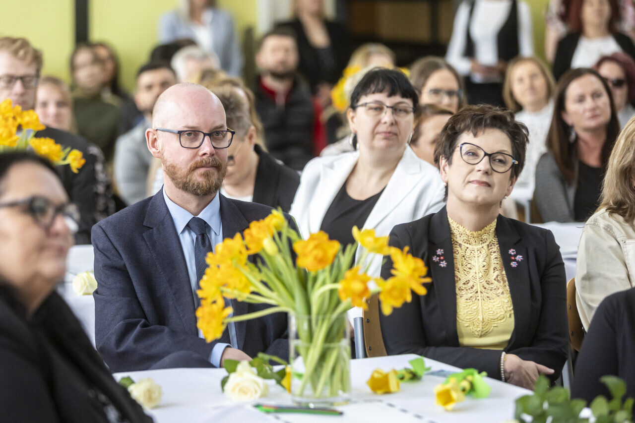 Gdańsk. W Szkole Podstawowej nr 69, odbył się uroczysty apel z okazji 60-lecia placówki. W uroczystościach udział wzięli między innymi: Senator Sławomir Rybicki, prywatnie absolwent tej szkoły, radne Agnieszka Bartków i Żaneta Geryk oraz Pomorski Kurator Oświaty Grzegorz Kryger. Nz. Pomorski Kurator Oświaty wraz z Dyrektor Urszulą Nazarko