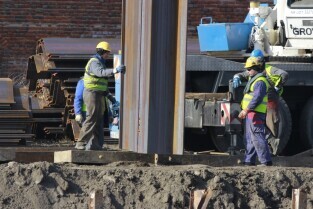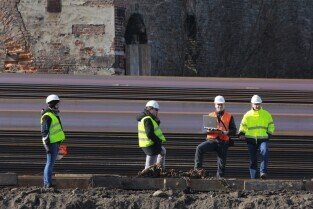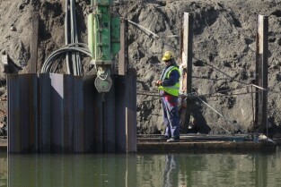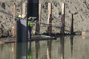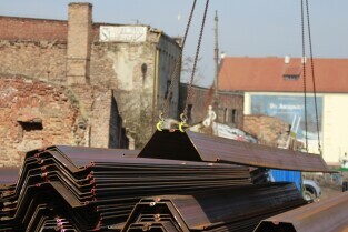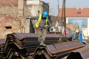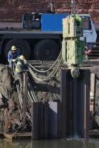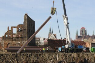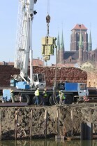 Prace przy odbudowie nabrzeży północnego cypla Wyspy Spichrzów w Gdańsku. Początek prac związanych z pogrążaniem ścianki szczelnej umacniającej nabrzeża.