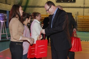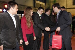VI Młodzieżowa Gala Sportu Gdańskiego. Hala sportowa MOSiR przy ul. Kołobrzeskiej 61 w Gdańsku Przymorze. Nz. upominki wręcza Wiceprzewodniczycy Komisji Sportu i Turystyki Rady Miasta Gdańska Marek Bumblis