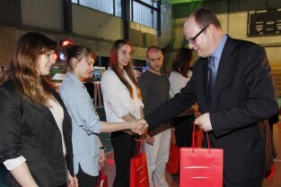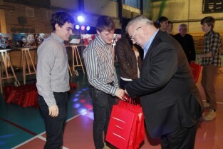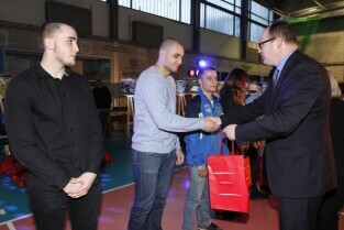 VI Młodzieżowa Gala Sportu Gdańskiego. Hala sportowa MOSiR przy ul. Kołobrzeskiej 61 w Gdańsku Przymorze. Nz. nagrody rzeczowe dla sportowców wręcza Prezydent Gdańska Paweł Adamowicz, a odbiera Adam Korol
