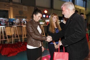 VI Młodzieżowa Gala Sportu Gdańskiego. Hala sportowa MOSiR przy ul. Kołobrzeskiej 61 w Gdańsku Przymorze. Nz. upominki wręcza Prezydent Gdańska Paweł Adamowicz