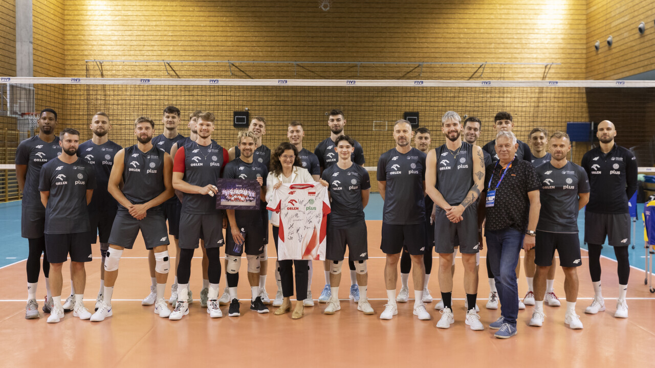 Gdańsk. VNL 2025 - Siatkarska Liga Narodów Mężczyzn. Wizyta prezydent Gdańska Aleksandry Dulkiewicz na treningu Polskiej Reprezentacji.