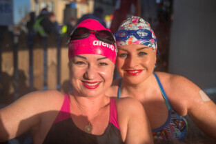 Gdańsk, Szafarnia. V Międzynarodowe Mistrzostwa Polski Morsów w pływaniu ekstremalnym na czas. Nz. Magdalena Sitkowska i Karolina Eliasz