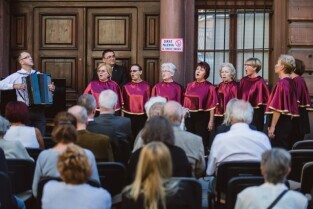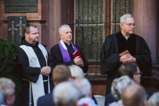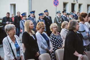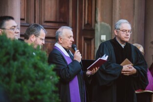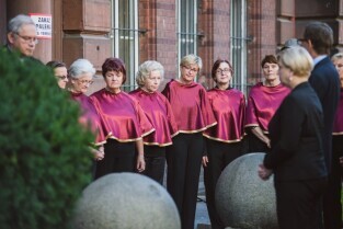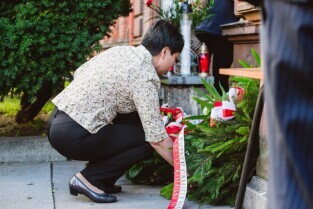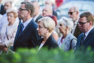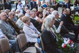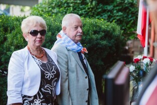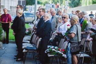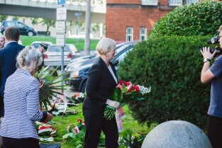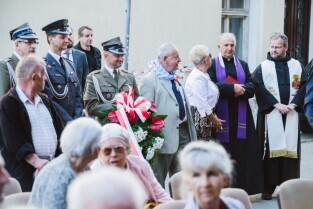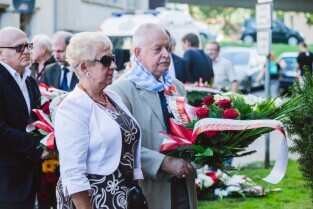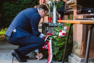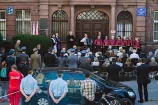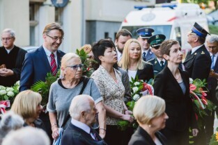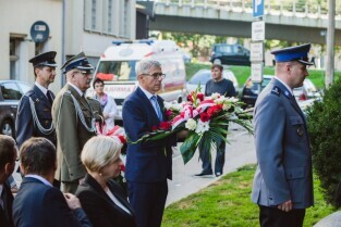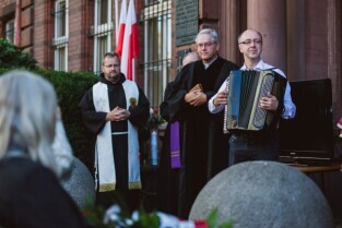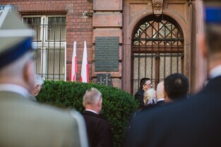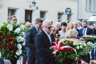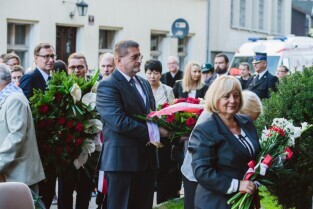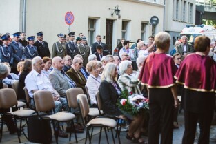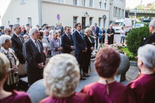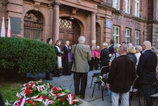 Budynek Międzyuczelnianego Wydziału Biotechnologii UG i AM. Modlitwa i złożenie kwiatów przy tablicy upamiętniającej miejsce kaźni Polaków we wrześniu 1939 r.