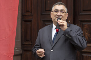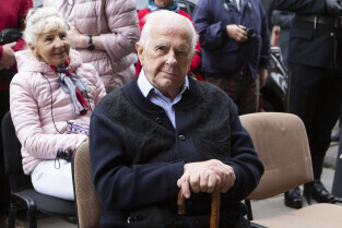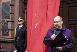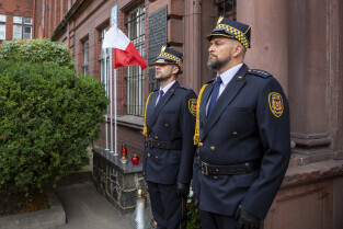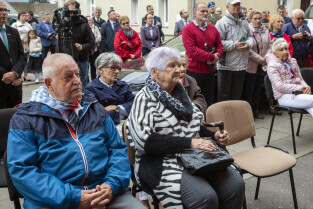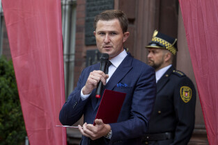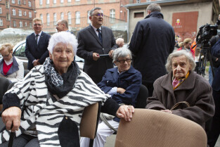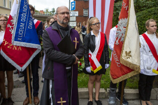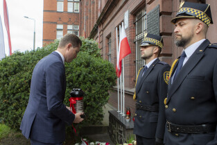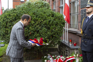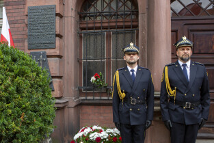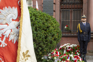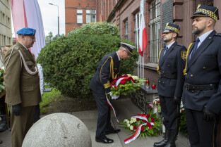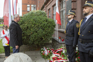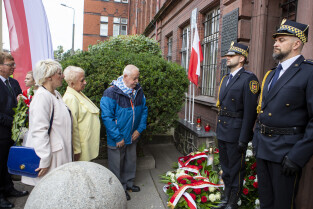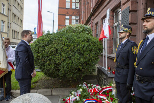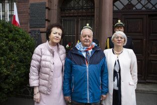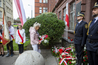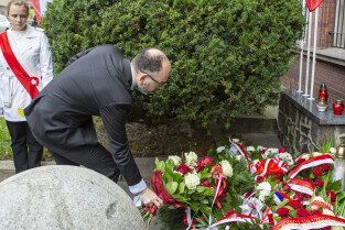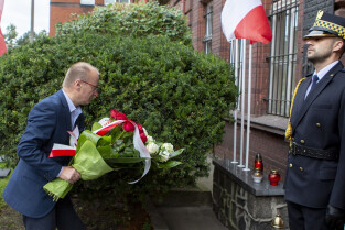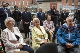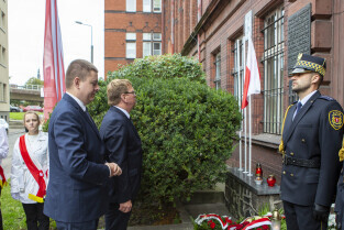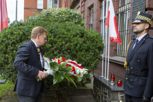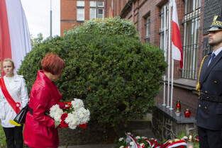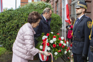 Rocznica wybuchu II Wojny Światowej. Złożenie kwiatów pod tablica upamiętniająca Polaków torturowanych i zamęczonych w pierwszych dniach II wojny światowej, dawna Victoriaschule. Gdańsk, ul. Kładki