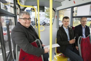 Video czat poświęcony gdańskiej komunikacji publicznej i mobilności aktywnej emitowany na stronie www gdansk.pl/czat. "Studiem" był zaparkowany na parkingu Urzędu Miejskiego autobus Iveco Kapena Urby, który pod koniec października rozpocznie kursy na nowej linii nr 100. W rozmowie z internautami wzięli udział: Z-ca Prezydenta Gdańska Maciej Lisicki (po środku), Kierownik Referatu Mobilności Aktywnej Remigiusz Kitliński (po lewej) i Z-ca Dyrektora Zarządu Transportu Miejskiego Sebastian Zomkowski (po prawej). Spotkanie prowadzi Pełnomocnik Prezydenta Gdańska ds. Inicjatyw i Konsultacji Społecznych Piotr Kowalczuk