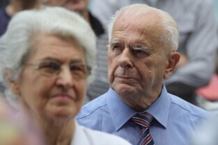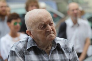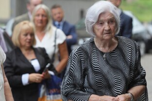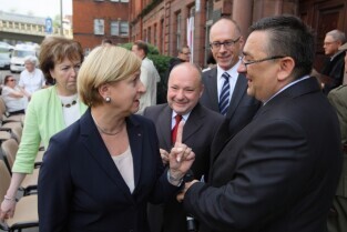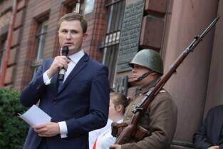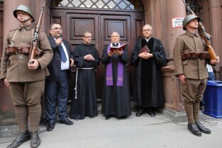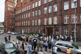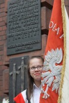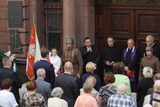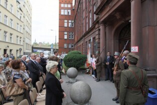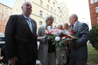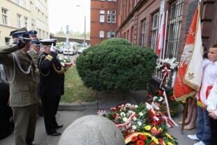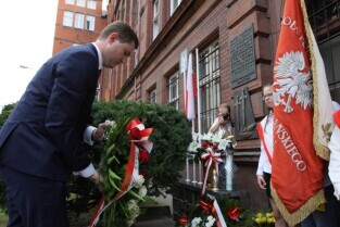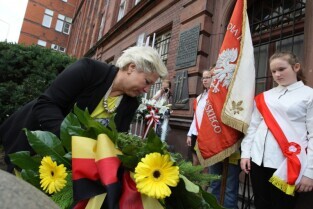 Modlitwa i złożenia wieńców przy tablicy upamiętniającej torturowanych i zamęczonych Polaków w pierwszych dniach II wojny światowej w budynku Viktoriaschule.