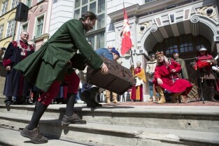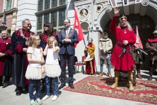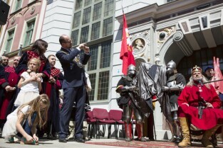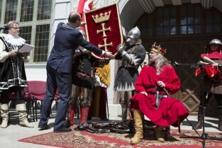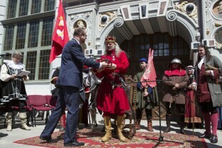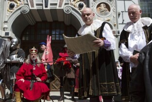 Gdańsk, Droga Królewska. Historyczna parada w ramach Święta Miasta na cześć króla Polski Kazimierza IV Jagiellończyka, który nadał Gdańskowi liczne przywileje. Nz. Prezydent Gdańska Paweł Adamowicz poprawia herb Gdańska