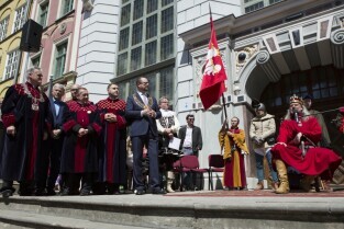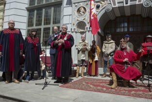 Gdańsk, Droga Królewska. Historyczna parada w ramach Święta Miasta na cześć króla Polski Kazimierza IV Jagiellończyka, który nadał Gdańskowi liczne przywileje. Nz. przemawia Przewodniczący Rady Miasta Gdańska Bogdan Oleszek