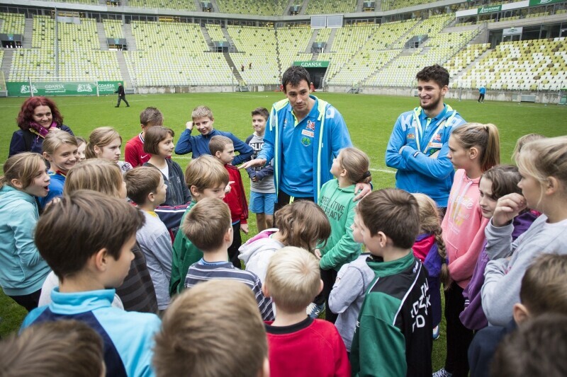 PGE Arena Gdańsk. Spotkanie z cyklu "WF z Mistrzem", które poprowadzili piłkarze ręczni SPR Wybrzeże Gdańsk: Marcin Lijewski (po środku), Michał Bednarek i Hubert Kornecki (po prawej)