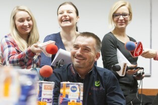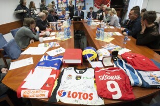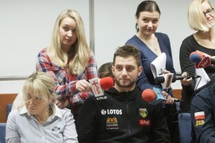 Urząd Miejski w Gdańsku. Konferencja prasowa poświęcona organizacji 22. Finału Wielkiej Orkiestry Świątecznej Pomocy na terenie Gdańska. Nz. Zawodnik Lotos Trefl Gdańsk Grzegorz Łomacz