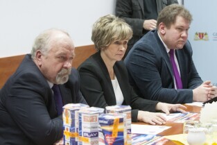 Urząd Miejski w Gdańsku. Konferencja prasowa poświęcona organizacji 22. Finału Wielkiej Orkiestry Świątecznej Pomocy na terenie Gdańska. Nz. od lewej: Dyrektor Biura Prezydenta Gdańska ds. Promocji Anna Zbierska, Prezydent Gdańska Paweł Adamowicz, szef Regionalnego Centrum Wolontariatu w Gdańsku Paweł Buczyński