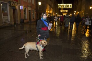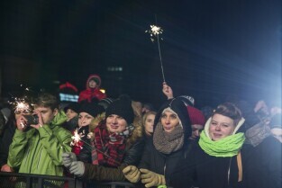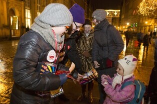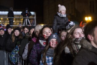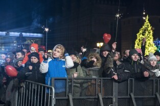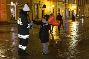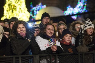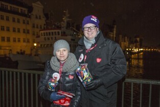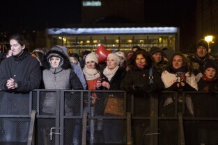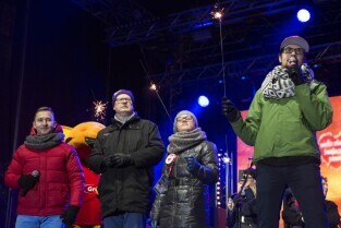 Gdańsk, Targ Węglowy. 23. Finał Wielkiej Orkiestry Świątecznej Pomocy. "Światełko do nieba". Po środku Prezydent Gdańska Paweł Adamowicz z córką Antoniną