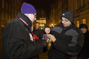 Gdańsk, ul. Długa i Długi Targ. 23. Finał Wielkiej Orkiestry Świątecznej Pomocy. Nz. kwestuje Prezydent Gdańska Paweł Adamowicz