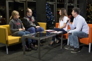 Gdańsk, Teatr Wybrzeże. 23. Finał Wielkiej Orkiestry Świątecznej Pomocy. Prezydent Gdańska Paweł Adamowicz z córką Antoniną w studiu TVP Gdańsk