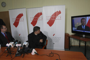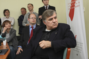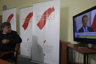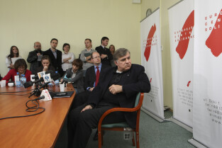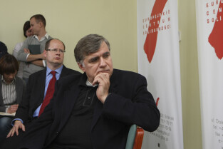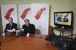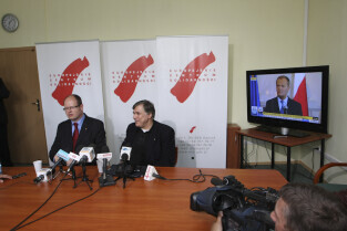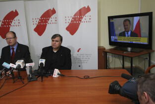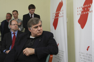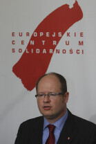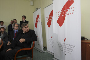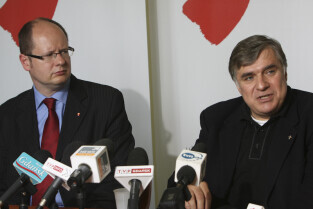 Prezydent Gdańska Paweł Adamowicz i Dyrektor ECS oo. Maciej Zięba w oczekiwaniu na decyzję Premiera RP Donalda Tuska w sprawie przeniesienia do Krakowa obchodów 20. rocznicy wolnych wyborów