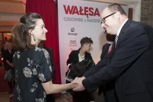 Gdańsk, Kino Neptun. Prapremiera filmu w reż. Andrzeja Wajdy "Wałęsa. Człowiek z nadziei". Nz. Agnieszka Grochowska, odtwórczyni roli Danuty Wałęsy i Prezydent Gdańska Paweł Adamowicz