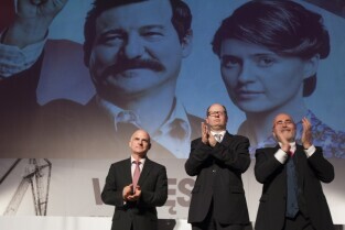 Gdańsk, Kino Neptun. Prapremiera filmu w reż. Andrzeja Wajdy "Wałęsa. Człowiek z nadziei". Nz. od lewej: Prezes Energa SA Mirosław Bieliński, Prezydent Gdańska Paweł Adamowicz, Prezes Akson Studio Michał Kwieciński
