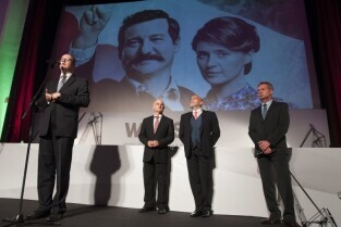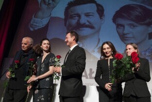 Gdańsk, Kino Neptun. Prapremiera filmu w reż. Andrzeja Wajdy "Wałęsa. Człowiek z nadziei". Nz. od lewej: scenarzysta filmu Janusz Głowacki, Agnieszka Grochowska, odtwórczyni roli Danuty Wałęsy, Robert Więckiewicz, odtwórca roli Lecha Wałęsy, Maria Rosaria Omaggio, odtwórczyni roli Oriany Fallacci