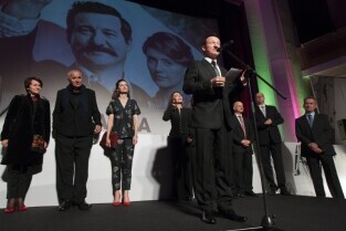 Gdańsk, Kino Neptun. Prapremiera filmu w reż. Andrzeja Wajdy "Wałęsa. Człowiek z nadziei". Nz. od lewej: Agnieszka Grochowska, odtwórczyni roli Danuty Wałęsy, Prezydent Gdańska Paweł Adamowicz, Robert Więckiewicz, odtwórca roli Lecha Wałęsy, Maria Rosaria Omaggio, odtwórczyni roli Oriany Fallacci, producent filmu Michał Kwieciński