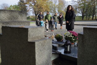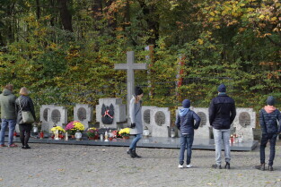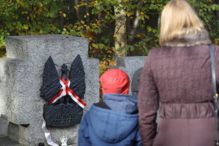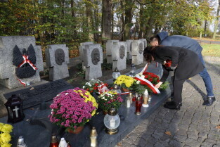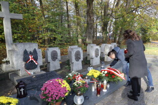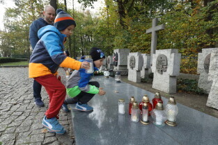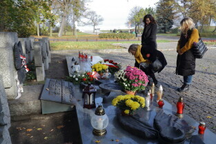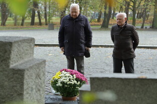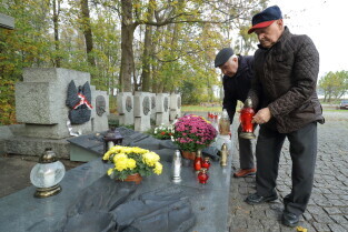 Gdańsk, Westerplatte. Prezydent Gdańska Aleksandra Dulkiewicz i mieszkańcy uczcili pamięć polskich bohaterów. Nz. Przedstawiciele Stowarzyszenia Godność Czesław Nowak i Mieczysław Wędrowski, którzy złożyli kwiaty i zapalili znicze na grobach Bohaterów.
