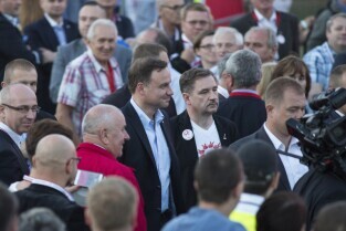 Widowisko muzyczne "My Naród" z okazji 35. rocznicy podpisania Porozumień Sierpniowych w 1980 r. Gdańsk, dawny teren Stoczni Gdańskiej. Nz. Prezydent RP Andrzej Duda i Przewodniczący NSZZ Solidarność Piotr Duda