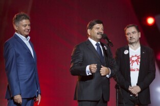 Widowisko muzyczne "My Naród" z okazji 35. rocznicy podpisania Porozumień Sierpniowych w 1980 r. Gdańsk, dawny teren Stoczni Gdańskiej. Nz. byli Przewodniczący NSZZ Solidarność Marian Krzaklewski (L) i Janusz Śniadek (S) oraz obecny Piotr Duda (P)