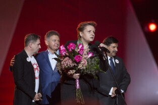 Widowisko muzyczne "My Naród" z okazji 35. rocznicy podpisania Porozumień Sierpniowych w 1980 r. Gdańsk, dawny teren Stoczni Gdańskiej. Nz. Minister Kultury i Dziedzictwa Narodowego Małgorzata Omilanowska, z tyłu po lewej Przewodniczący NSZZ Solidarność Piotr Duda oraz byli przewodniczący Marian Krzaklewski i Janusz Śniadek