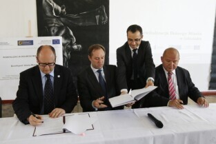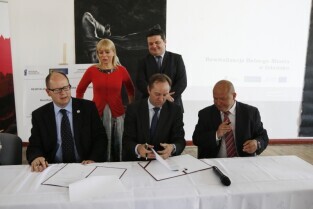 Marszałek Woj. Pomorskiego Mieczysław Struk i jego zastępca Wiesław Byczkowski oraz Prezydent Gdańska Paweł Adamowicz i Skarbnik Gdańska Teresa Blacharska podpisali zwiększający o 3,5 mln zł aneks do umowy na unijne dofinansowanie projektu "Rewitalizacja Dolnego Miasta w Gdańsku".