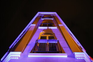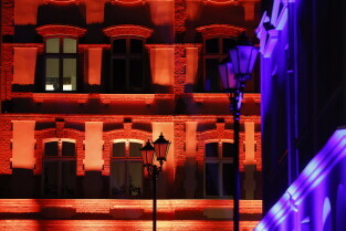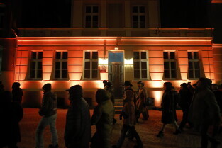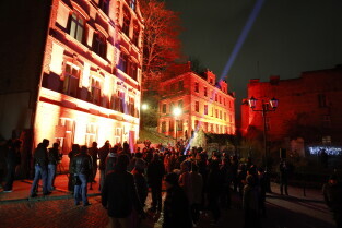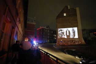 Gdańsk.Wieczorny finał święta “Biskupia bliżej…” Nz. Projekcja na ścianie – Nieme kino „Podróż Nataniela W. czyli przyczynek do rozważań o przeszłości Biskupiej Górki”