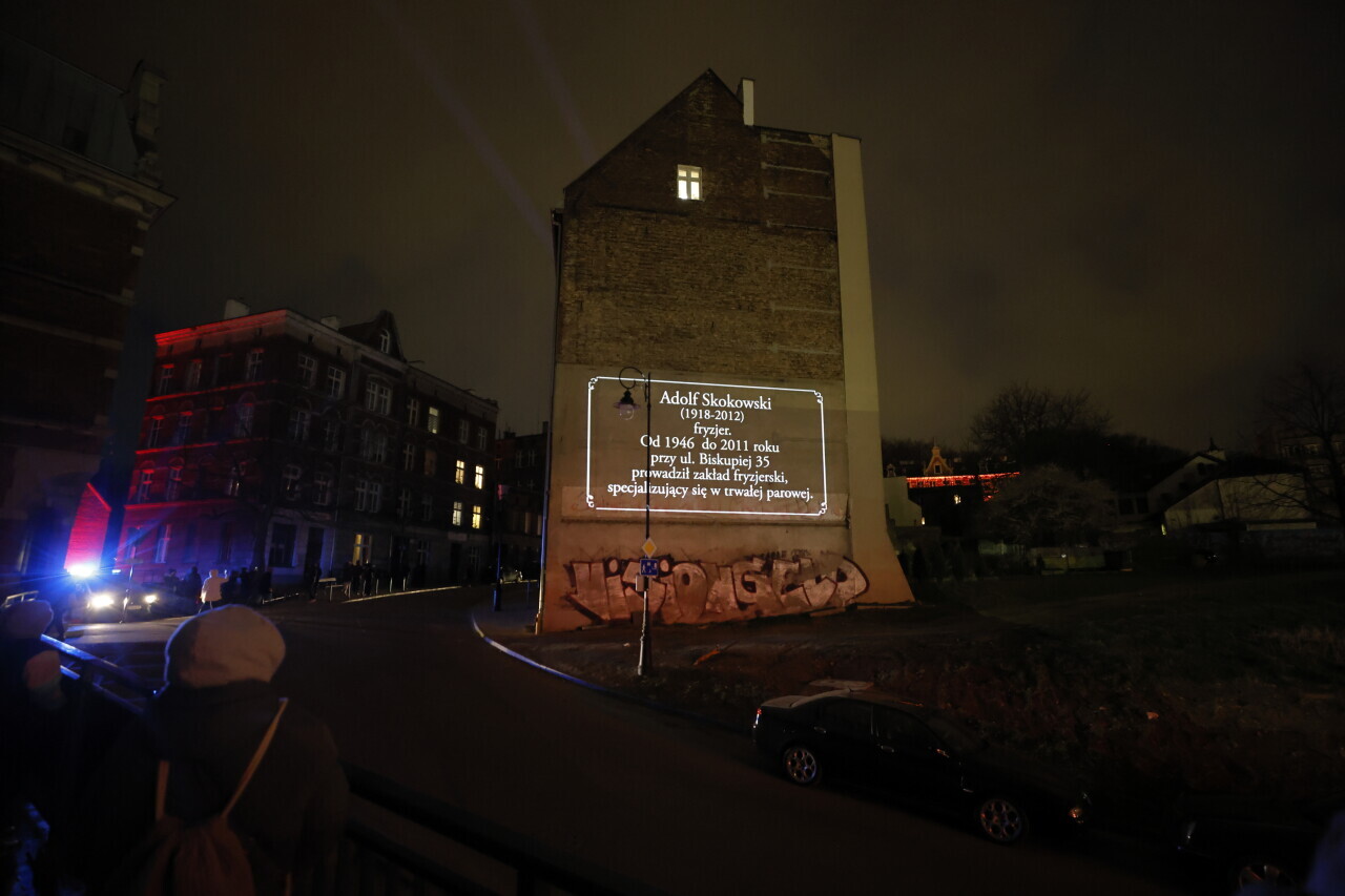 Gdańsk.Wieczorny finał święta “Biskupia bliżej…” Nz. Projekcja na ścianie – Nieme kino „Podróż Nataniela W. czyli przyczynek do rozważań o przeszłości Biskupiej Górki”