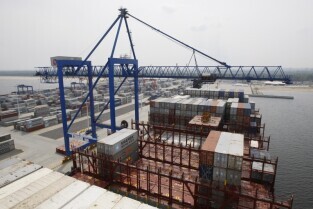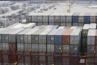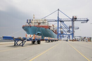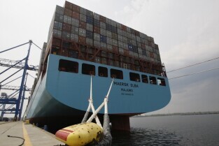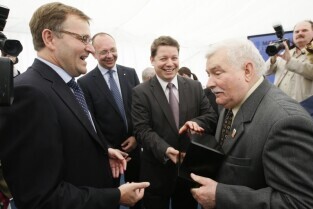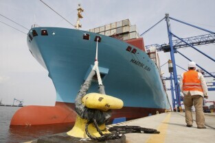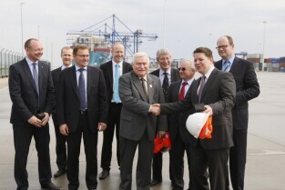 Do nabrzeża terminala DCT w Porcie Północnym wpłynął największy kontenerowiec w historii gdańskich przeładunków. 366 metrowy gigant Maersk Elba może przewieźć na swoim pokładzie 13092 kontenerów (TEU). Gdyby w każdym kontenerze znajdowały się tylko banany, to na każdego Polaka przypadałoby 16 szt. tego owocu. Dzięki swojej masie po rozpędzeniu Elby do maksymalnych 25 węzłów, a następnie wyłączeniu silników statek przepłynąłby jeszcze ok. 15 km. Nz. Eivind Kolding (Prezes Maersk Line) i Boris Wenzel (Prezes DCT Gdańsk) wręczają Lechowi Wałęsie 5 kilogramową rzeźbę przedstawiającą terminal kontenerowy